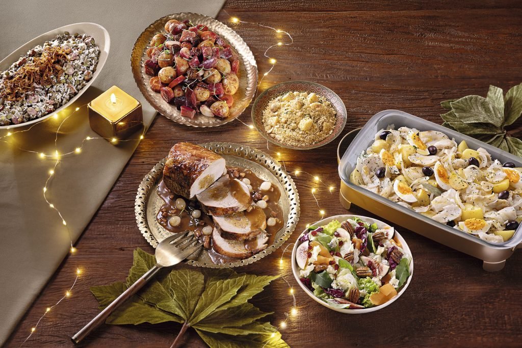 Mesa posta com a Ceia Boas-Festas no Pão para 6 a 8 pessoas, em clima de fim de ano. Em destaque, travessa com carne fatiada ao molho, acompanhada de salpicão cremoso com frutas, farofa dourada, arroz natalino e uma salada colorida. A composição é iluminada por microlâmpadas decorativas e uma vela, sobre fundo de madeira com folhas douradas, reforçando o clima de Natal e Ano Novo e destacando os pratos prontos e sofisticados para a ceia.