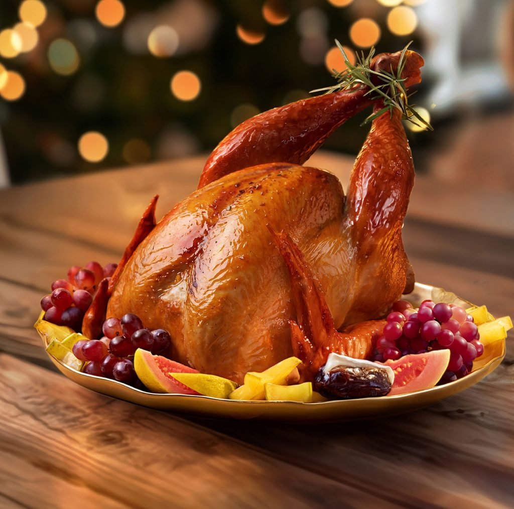 Peru assado inteiro, bem dourado e suculento, servido em um prato sobre mesa de madeira. Ao redor da ave há guarnições coloridas, como frutas e legumes, compondo uma ceia convidativa. Ao fundo, vê-se uma árvore de Natal iluminada e outros enfeites de fim de ano desfocados, reforçando o clima aconchegante das festas e remetendo às ceias especiais da Ceias no Pão.
