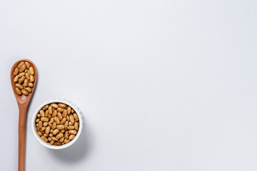 Foto minimalista vista de cima, com fundo totalmente branco. À esquerda, uma colher de madeira cheia de feijão-jalo cru; logo ao lado, um pequeno pote branco também repleto de grãos. Os feijões são maiores, em tom amarelado ou castanho-claro, com rajadas discretas. A composição limpa destaca o feijão-jalo como um dos tipos de feijão presentes na lista de 11 grãos mais consumidos, ideal para ensopados e pratos do dia a dia.